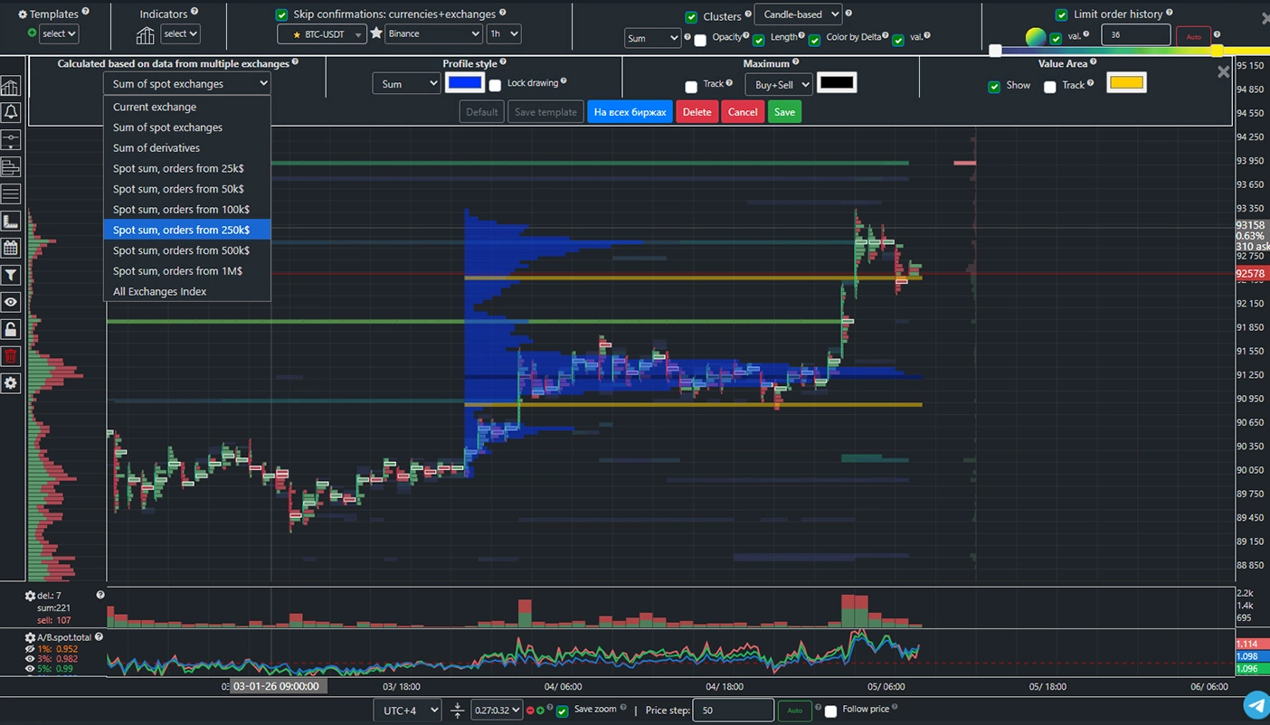 Unique cluster chart mode — "Spot Exchanges Aggregate". Combines all limit and market orders from top liquidity spot platforms into a unified cluster chart, revealing true market structure beyond single-exchange data. Binance (usdt, tusd, fdusd, busd), Coinbase, Bitfinex, Bitstamp, Htx, Okx, Bybit, Mexc, KuCoin, Bitget. Allows you to assess the overall spot market, all limit order walls, and market orders on a single chart—regardless of the exchange they were placed on.