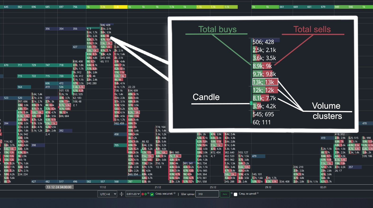 The cluster chart displays the volume of buys and sells executed at each price level within a specific candle. Utilizing this information helps identify zones of interest, as well as entry and exit points of major market players.