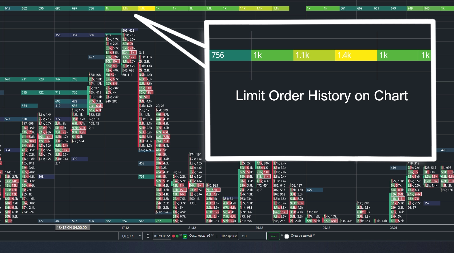 The ClusterBTC analytics system allows you to overlay the cluster chart with historical data on large limit order movements. By analyzing how major order walls shift and tracking buy/sell volumes near these walls, you can accurately identify strong support and resistance zones.