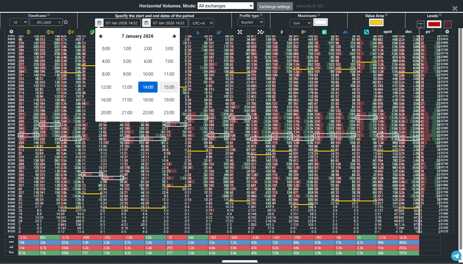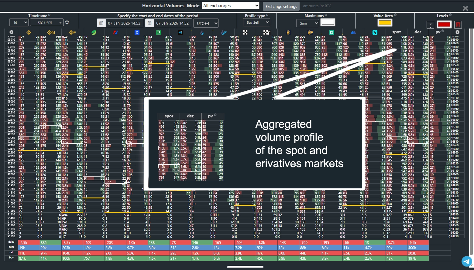 Set your desired timeframe or use a custom date range. You can also overlay the volume profile directly on the price chart and switch to a detailed analytics mode across all exchanges. The unique Power Volume (PV) index reveals the cumulative strength of volume at each price level across all platforms.