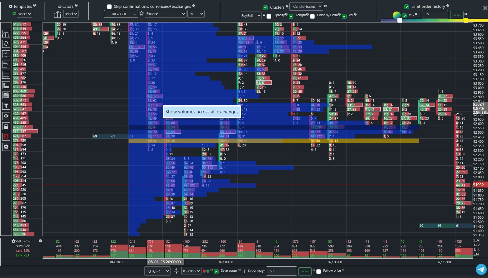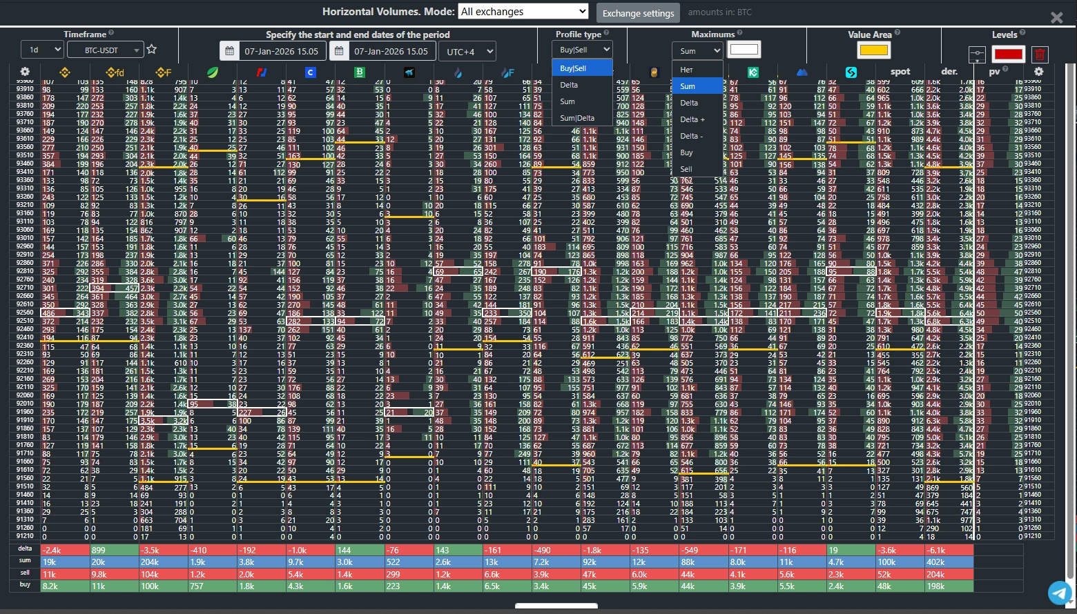 Analyze the volume profiles of Bitcoin, Ethereum, and other cryptocurrencies across all major exchanges on a single screen. Volume profiles are displayed opposite each other, making it easy to identify zones of interest by comparing volume data from the most liquid trading venues. Extensive customization options for profiles, highs/lows, and value area determination.