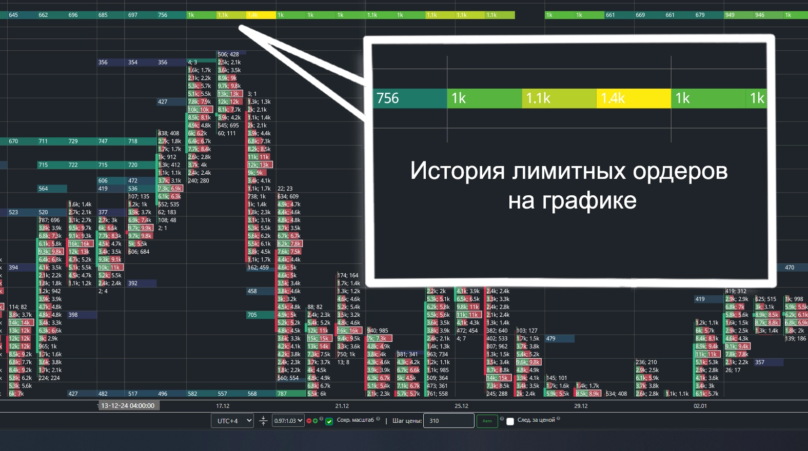 Кластерный график Биткоина и других криптовалют с добавлением истории движения крупных лимитных ордеров