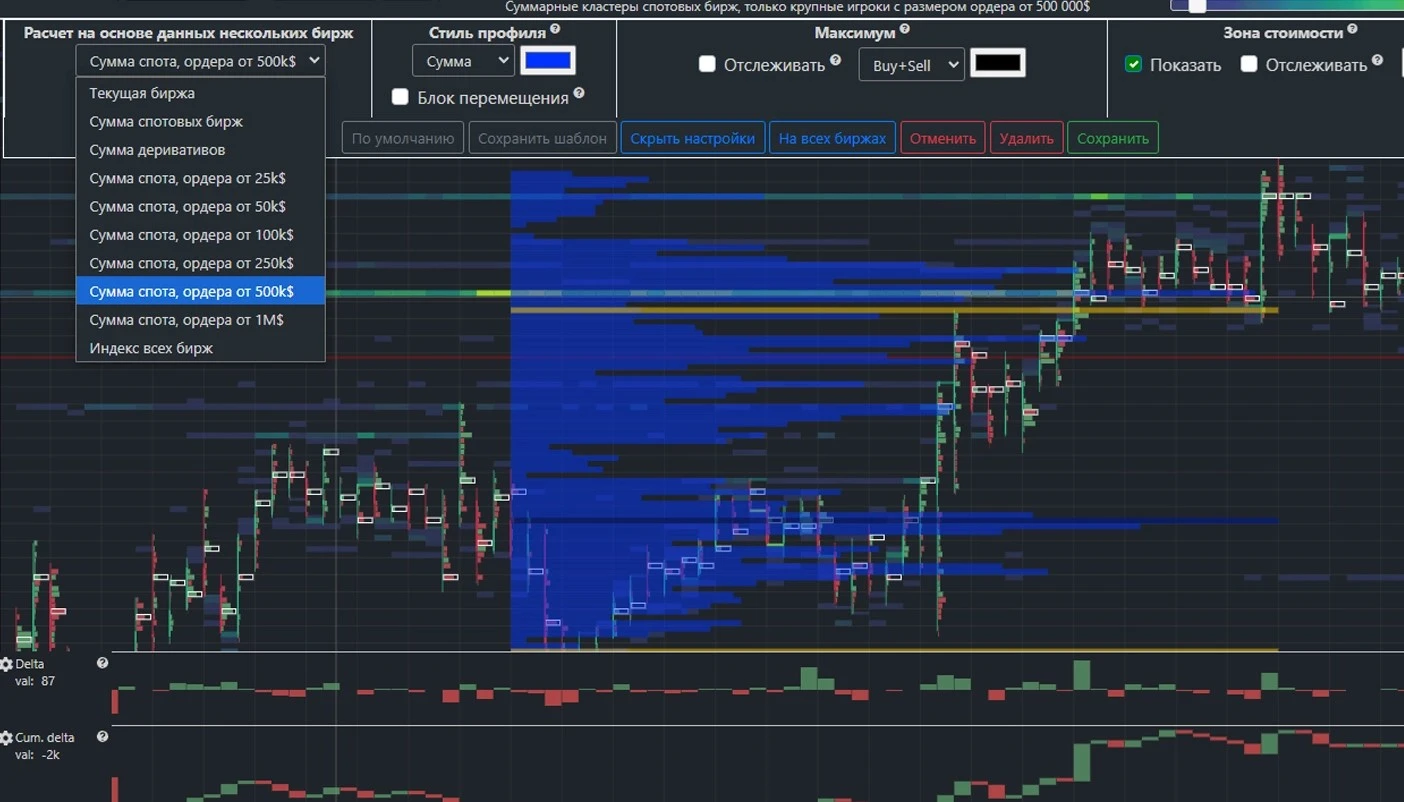 Уникальный режим работы кластерного графика - «Сумма спотовых бирж». Суммирует все лимитные и рыночные ордера создавая единый кластерный график с самых ликвидных спотовых площадок. Binance (usdt, tusd, fdusd, busd), Coinbase, Bitfinex, Bitstamp, Htx, Okx, Bybit, Mexc, KuCoin, Bitget. Позволяет на одном графике оценить общий спотовый рынок, все лимитные стены и рыночные ордера, не важно на какой площадке они были размещены.